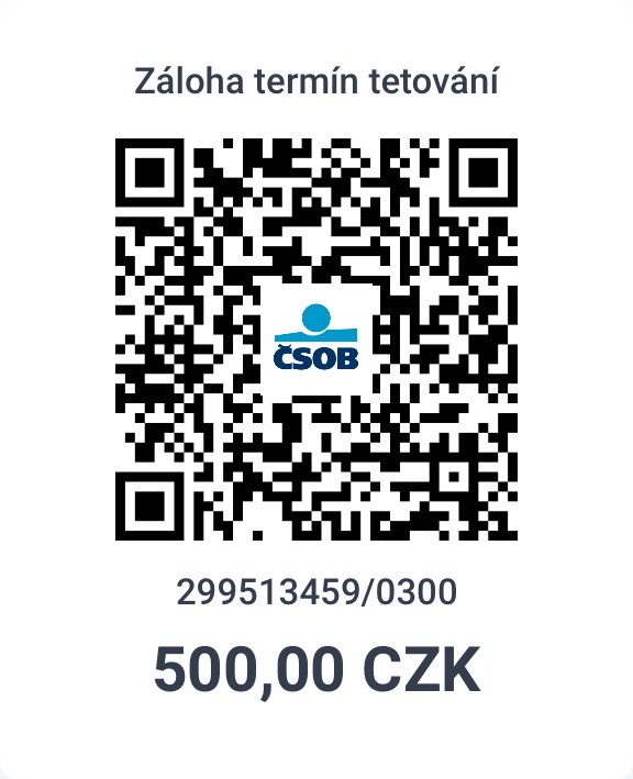 Pro usnadnění platby můžeš využít tento QR kód. Do zprávy pro příjemce napiš „SVÉ JMÉNO, PŘÍJMENÍ + TERMÍN TETOVÁNÍ“.